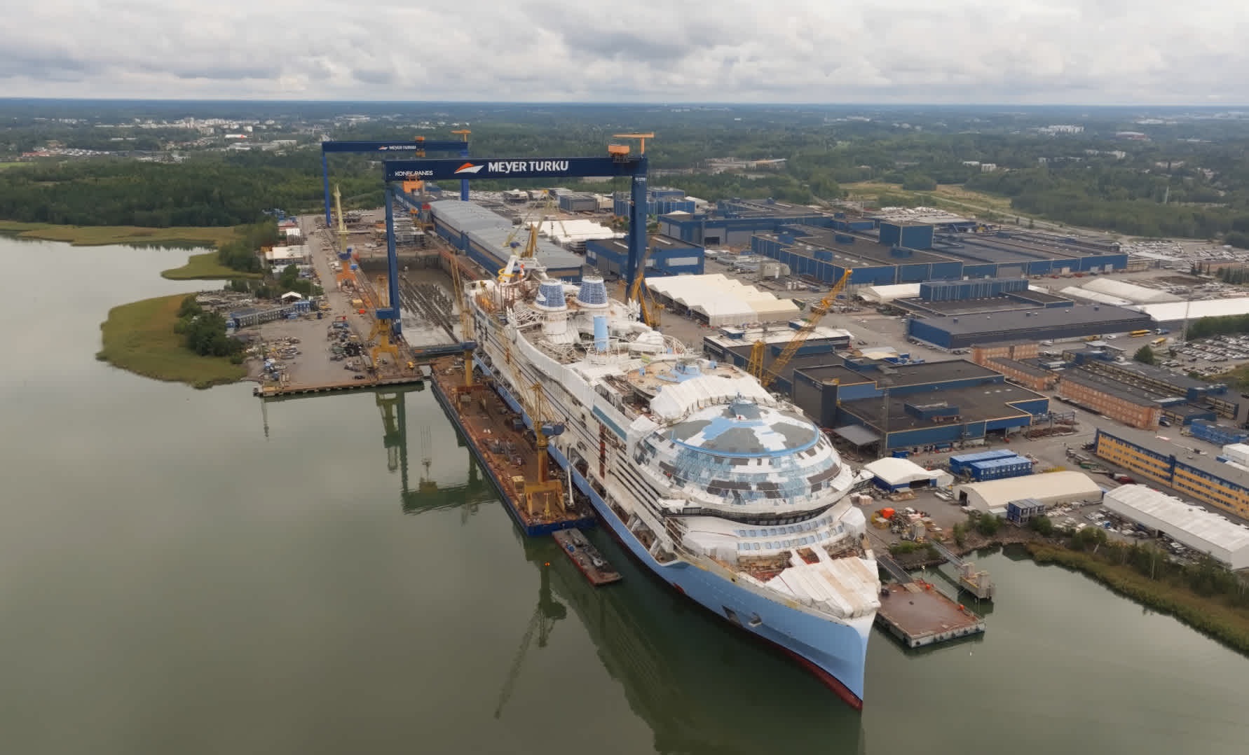 Legend of the Seas* officially touched water for the first time. The teams behind the construction celebrated the moment as the newest family vacation floated out at the Meyer Turku shipyard in Turku, Finland, where Legend will continue to take shape ahead of its August 2026 debut.