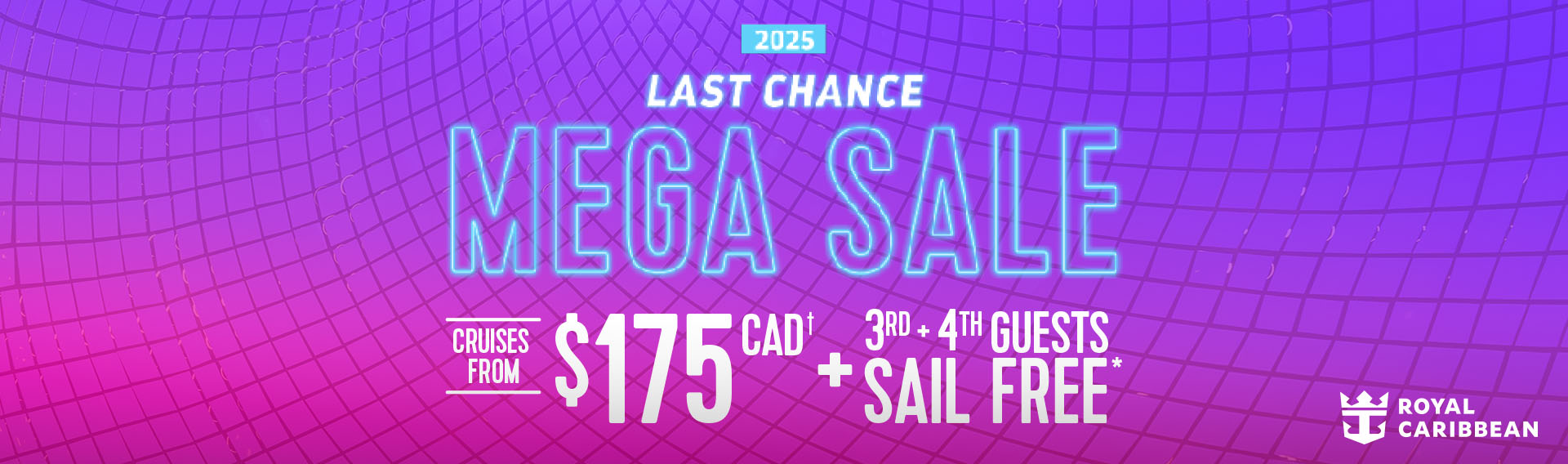 Last Chance Mega Sale applies to new and individual bookings made December 9, 2025 – December 15, 2025, on the sailings listed under “Last Chance Mega Sale” under the Deals section of RoyalCaribbean.com and provides discounted pricing at the rates displayed. Last Chance Mega Sale sailings are combinable with Free 3rd and 4th Guests but are NOT combinable with any other offer or promotion, including but not limited to BOGO60, Kids Sail Free, promotional OBCs, Next Cruise offers, instant savings, restricted discounts (e.g. Seniors, Residents, Military), Promo Code driven offers, Crown and Anchor discounts, Shareholder Benefits, Standard Group, Interline, Travel Agent, Travel Agent Friends and Family, Weekly Sales Events and Net rates. Individual reservations may be transferred into an existing group, assuming required criteria are met; full deposit will be required at time of transfer. Failure to apply the required full deposit amount may result in a cancellation of the booking. Last Chance Mega Sale is available to residents of United States, Canada, Puerto Rico, and select countries. Prices and offers are subject to availability and change without notice; capacity controlled and may be withdrawn at any time. Refer to www.RoyalCaribbean.com for additional terms and conditions. Royal Caribbean International reserves the right to correct any errors, inaccuracies, or omissions and to change or update fares, fees, and surcharges at any time without prior notice. ©2025 Royal Caribbean Cruises Ltd. Ships’ registry: Bahamas.