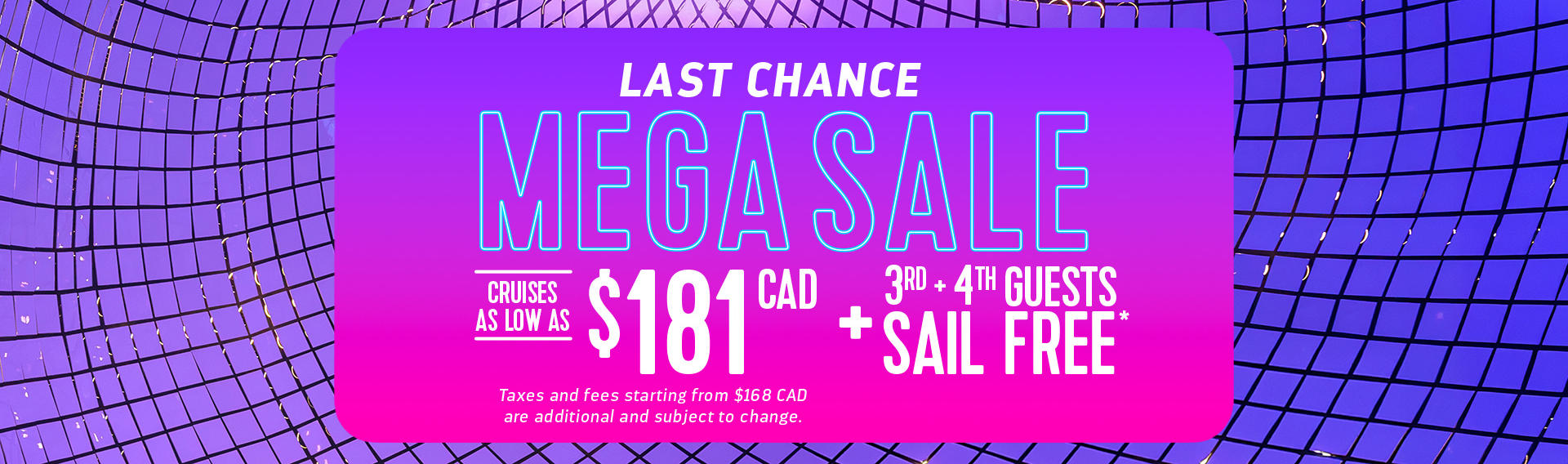 Last Chance Mega Sale applies to new and individual bookings made December 24, 2025 - January 7, 2026, on the sailings listed under “Last Chance Mega Sale” under the Deals section of RoyalCaribbean.com and provides discounted pricing at the rates displayed. Taxes and fees are additional and vary per sailing. Last Chance Mega Sale sailings are combinable with Free 3rd and 4th Guests but are NOT combinable with any other offer or promotion, including but not limited to BOGO60, Kids Sail Free, promotional OBCs, Next Cruise offers, instant savings, restricted discounts (e.g. Seniors, Residents, Military), Promo Code driven offers, Crown and Anchor discounts, Shareholder Benefits, Standard Group, Interline, Travel Agent, Travel Agent Friends and Family, Weekly Sales Events and Net rates. Individual reservations may be transferred into an existing group, assuming required criteria are met; full deposit will be required at time of transfer. Failure to apply the required full deposit amount may result in a cancellation of the booking. Last Chance Mega Sale is available to residents of United States, Canada, Puerto Rico, and select countries. Prices and offers are subject to availability and change without notice; capacity controlled and may be withdrawn at any time. Refer to www.RoyalCaribbean.com for additional terms and conditions. Royal Caribbean International reserves the right to correct any errors, inaccuracies, or omissions and to change or update fares, fees, and surcharges at any time without prior notice. ©2026 Royal Caribbean Cruises Ltd. Ships’ registry: Bahamas.