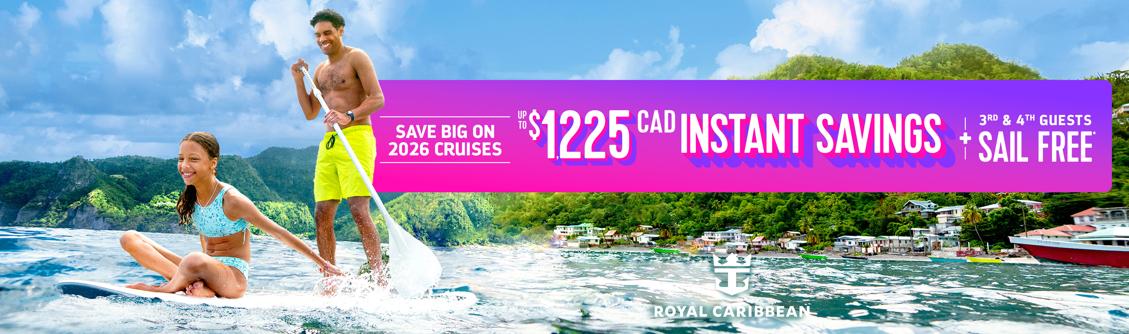 General Terms: Instant savings amount shown in USD and will be converted to currency used for cruise purchase applied as instant rebate to the cruise fare at checkout reflected as “Dollars Off” or “Savings”. All other charges, including taxes, fees, and port expenses, where not included in the price displayed are additional and apply to all guests. Changes to the booking may result in the removal of the offer. Individual reservations may be transferred into an existing group, assuming the required criteria are met; full deposit will be required at time of transfer. Failure to apply the required full deposit amount may result in the cancellation of the booking. Single occupancy guests paying 200% cruise fare are eligible for full offer; single occupancy guests paying less than 200% cruise fare are eligible for a prorated amount of the offer. Offers available to residents of United States, Canada, Puerto Rico, and select countries in the Caribbean. Prices and offers are subject to availability and change without notice; capacity controlled and may be withdrawn at any time. Refer to www.RoyalCaribbean.com for complete terms and conditions. Royal Caribbean International reserves the right to correct any errors, inaccuracies, or omissions and to change or update fares, fees, and surcharges at any time without prior notice. ©2026 Royal Caribbean Cruises Ltd. Ships’ registry: Bahamas.